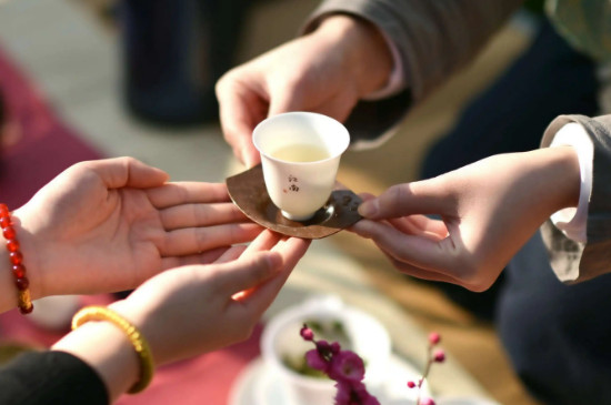 将茶水倒入茶杯之后,第一杯茶首先需要端送给客人品尝,使用茶盘托起茶杯送至客人的右手除,使用右手向客人做出请的手势,以示欢迎个人品茶,饮茶礼节十分重要。